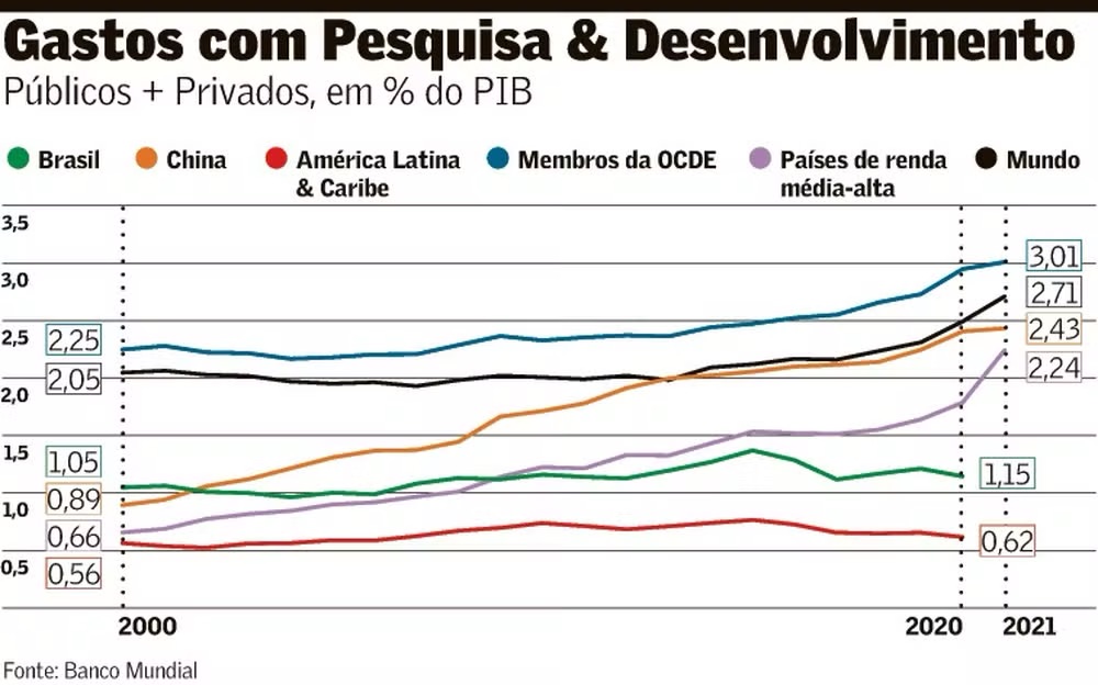 Destaco aqui a importância crucial do investimento em Pesquisa e Desenvolvimento (P&D) para o progresso e o crescimento das nações. O investimento em P&D desempenha um papel fundamental no desenvolvimento econômico, social e tecnológico de um país. E ao final mostro em gráfico os investimentos realizados com base nos dados do Banco Mundial.