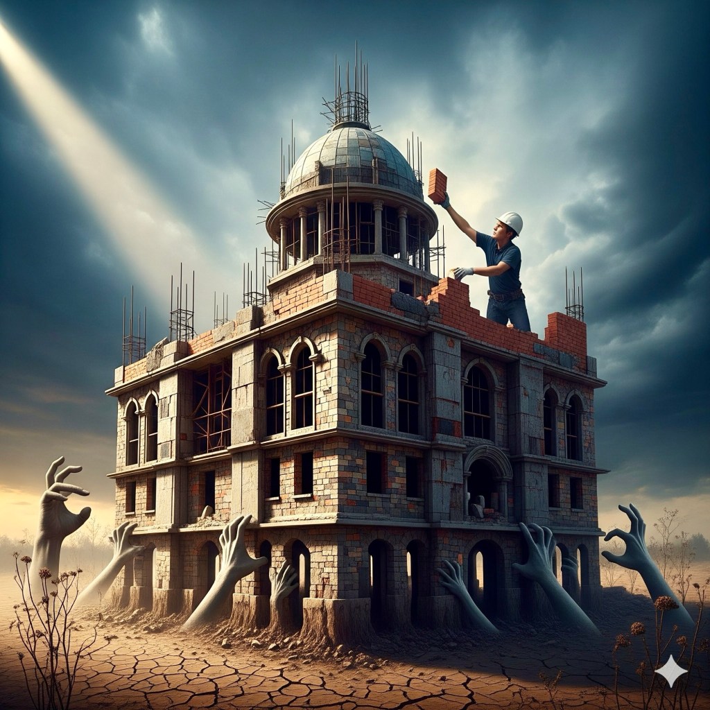 A imagem representa a república como uma construção grandiosa, porém inacabada e frágil, erguida sobre um solo rachado. As mãos sombrias que puxam seus alicerces simbolizam as forças do subdesenvolvimento que minam constantemente o projeto de nação, enquanto a figura solitária do construtor, sob um raio de luz, representa a persistência e a esperança na continuidade dessa construção, apesar de todas as adversidades.