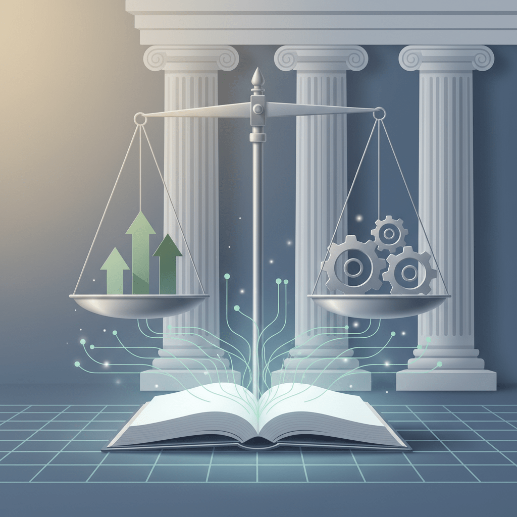 A balança da justiça equilibra crescimento (flechas) contra mecanismo (engrenagens), enquanto a rede digital flui do conhecimento institucional. Metáfora visual para o paradoxo do CADE: apesar de seu mandato de defesa da concorrência, as decisões frequentemente reforçam concentração econômica, beneficiando grandes players que moldam a interpretação técnica das regras. Os pilares clássicos representam a solidez formal da instituição; a rede digital, a captura silenciosa por influência e poder.