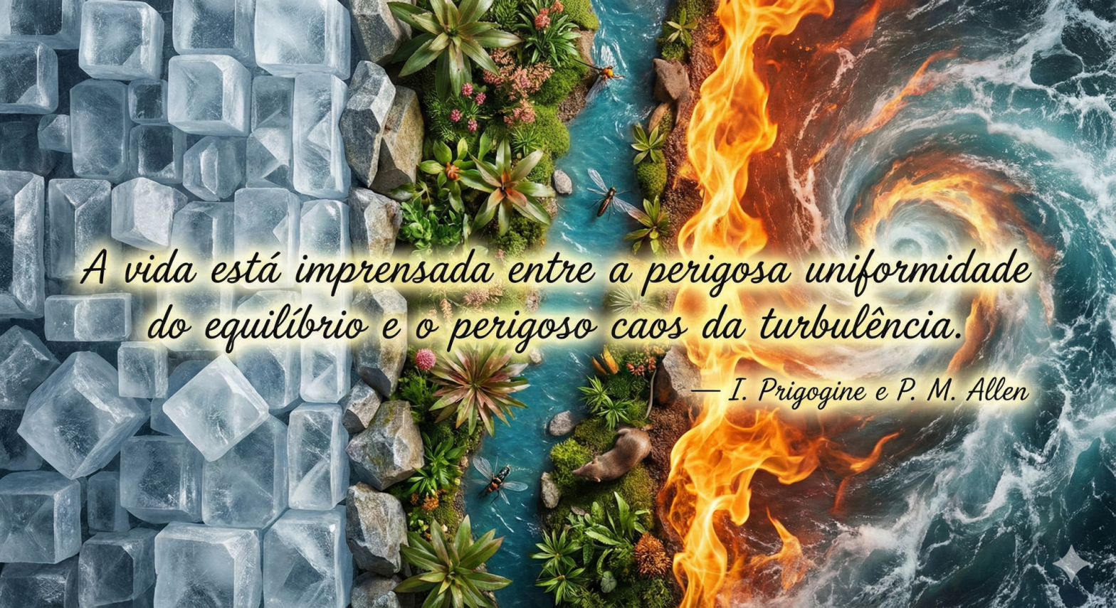 À esquerda, o gelo da “uniformidade do equilíbrio” representa o dogmatismo, a repetição cega de métodos e teorias que já não explicam o mundo — é a estagnação intelectual. À direita, o fogo do “caos” é a dispersão, a leitura sem filtro, a acumulação de dados sem tese. A vida — e o conhecimento real — floresce apenas no centro, na “margem do caos”. É ali, onde a estrutura encontra a flexibilidade, que a inovação acontece. Pesquisar é ter a coragem de habitar essa zona de tensão, usando o rigor não para congelar o pensamento, mas para navegar a turbulência com propósito.
