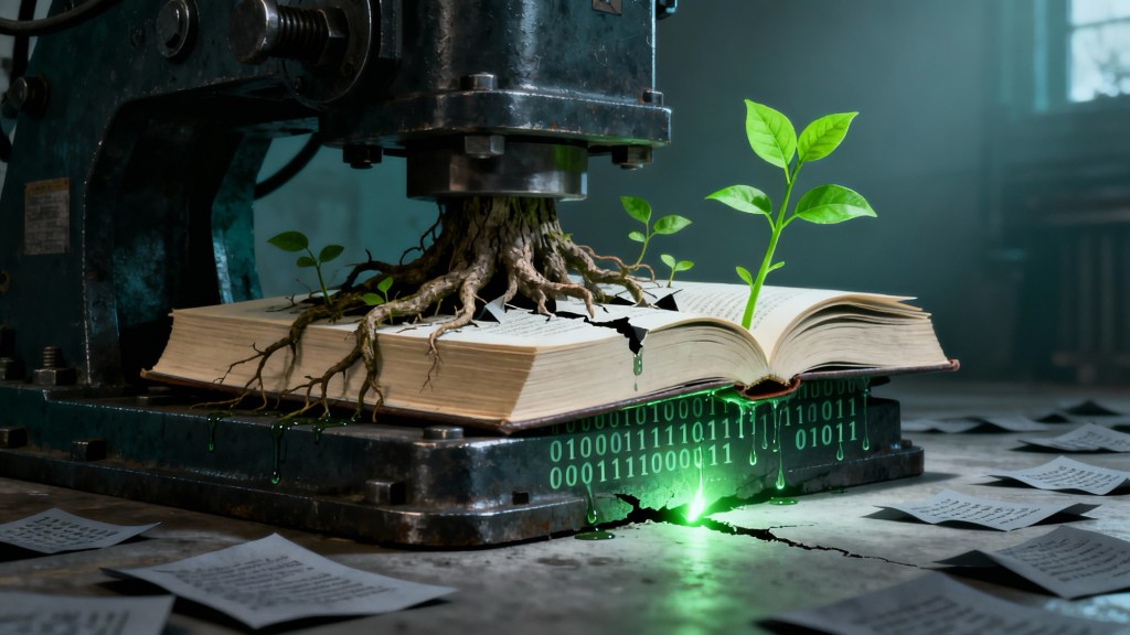 A imagem busca capturar a essência do texto: a pressão do sistema de métricas sobre a criatividade e a profundidade da pesquisa, mas também a resiliência e a esperança de um conhecimento que busca florescer.